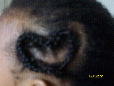As I began cornrowing C's hair, I noticed that even with loose braiding I seemed to be pulling her baby hair near the crown. I'm working on some no-stress styles for the summer in hopes of that hair thickening up and growing, so I want to leave it alone. By the way- you never want to cause stress on the hairline even if you are'nt trying to grow it out!